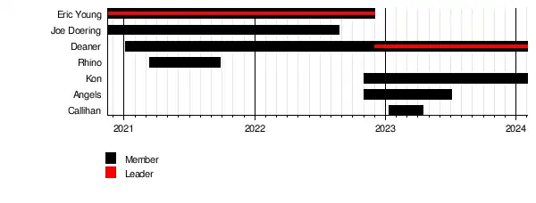 The stable was formed on November 14, 2020 at the Turning Point event, where Doering debuted as Eric Young's enforcer.[4][5] The group would later be expanded with the additions of Deaner[6] and Rhino.[7] Rhino was kicked out of the stable in September 2021. After Joe Doering's brain cancer returned, he would go on hiatus from professional wrestling in September 2022. After weeks of teasing new members, Angels and Kon would join in November 2022. In December 2022, Deaner would become the leader, with Callihan joining for a short time.