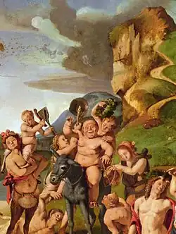 The subject is from Book III of Ovid's Fasti, which had been published in Venice in 1497.[2] At the centre is a group of satyrs and bacchantes who make noises to get a swarm of bees to settle in the trunk of a hollow tree. From left and right, more companions of Bacchus join the event, including Silenus, who rides in from the right on an ass, visibly drunk and supported by satyrs and bacchantes. In the foreground to the right are Bacchus, leaning on a thyrsus, and Ariadne, who points at the wreath on the god's head.[3] To the upper left is a town and to the upper right are a steep hill and a forest.[1]