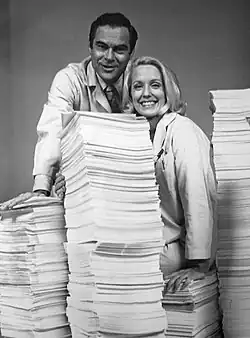 James Pritchett (Matt Powers) and Elizabeth Hubbard (Althea Davis) with ten years worth of scripts on the show's tenth anniversary April 1st 1973