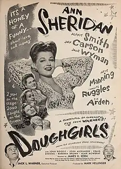 The Doughgirls is a 1944 American comedy film directed by James V. Kern based on the 1942 hit Broadway play written by Joseph Fields. The film works around three newlywed couples, focusing on the Halstead couple, played by Jane Wyman and Jack Carson, and their misadventures trying to find some privacy and living space in the housing shortage of WWII era Washington, D.C. Eve Arden as a Russian sniper and Joe DeRita as a sleepy hotel guest, both looking for edge in the overcrowded hotel.[1]