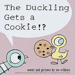 The Duckling Gets a Cookie!? is a 2012 picture book by Mo Willems. It is about a duckling that asks for, and receives, a cookie, a pigeon that complains about it, but is then flummoxed when the duckling passes the cookie to him.