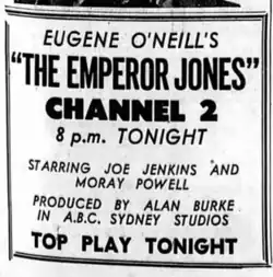 The Emperor Jones is a 1960 Australian TV play based on the play The Emperor Jones by Eugene O'Neill. It starred Joe Jenkins, a dancer who was living in Australia. He played a triple role.[4]
