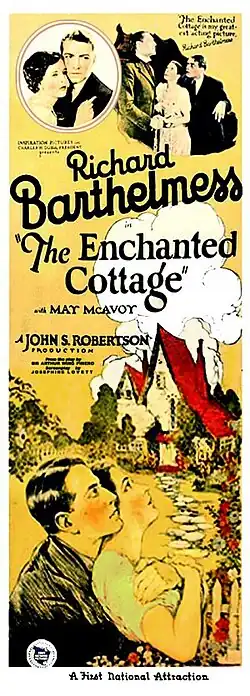 The Enchanted Cottage is a 1924 American silent drama film directed by John S. Robertson[1] based upon a 1923 play by Arthur Wing Pinero.[2] The film was produced by Richard Barthelmess, through his company Inspiration, and released through Associated First National. Barthelmess and May McAvoy star in the drama, [3][4] which shows how two lonely people—a young man mutilated in war and a plain young woman—experience the transforming power of love.