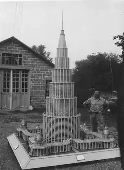 Auriti, an auto-mechanic by trade in Kennett Square, Pennsylvania, worked on his model of a cylindrical tower for over three years. He constructed it on a 1:200 scale. The model stands 11 feet tall, with a horizontal diameter of 7 feet. It is made of wood, plastic, glass, metal, hair combs, and model kit parts, crowned with the television antenna. Auriti went so far as to acquire a patent and exhibit the model both in a storefront and a bank lobby, but his dream of a tower housing the totality of knowledge and dominating the skyline of the US capital was never realized. Following its debut the work was neglected in a warehouse for decades before entering the collection of the American Folk Art Museum.[3]