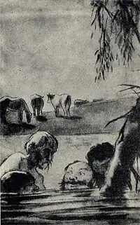 A herd of cattle appears on the bank, followed by the shepherd Yefim. He joins the company, with his own set of directives on how exactly the fish should be extracted from its hiding. The sounds of panic are heard from the landlord's house: it turns out that the cattle have invaded the garden. The landlord Andrey Andreitch appears, feeling very angry, but, intrigued by the news of an eelpout defying its catchers from under a tree, first orders his coachman Vasily to join the team, then, exasperated with the foursome's incompetence, undresses and goes into the pond himself.