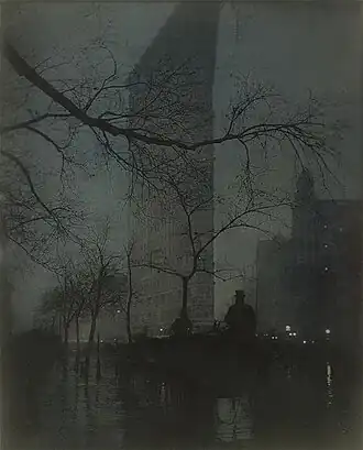 The Flatiron is a colored photograph made by Luxembourgish American photographer Edward Steichen. The photograph depicts the recently erected Flatiron Building in New York, taking inspiration from fellow photographers like Alfred Stieglitz, who had just photographed the building a year prior.[1]: 187  The original negative was made in 1904 and spawned three platinum-gum exhibition prints in brown (1905), blue-green (1909), and yellow-green-black (1904–1909; uncertain).[2]: 24