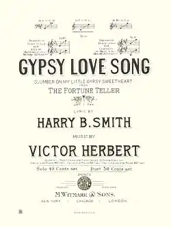 The Fortune Teller is an operetta in three acts composed by Victor Herbert, with a libretto by Harry B. Smith. After a brief tryout in Toronto, it premiered on Broadway on September 26, 1898, at Wallack's Theatre and ran for 40 performances. Star Alice Nielsen and many of the original company traveled to London, where the piece opened at the Shaftesbury Theatre on April 9, 1901, running for 88 performances.[1] It was revived in New York on November 4, 1929, at Jolson's 59th Street Theatre, starring Tessa Kosta, and ran for 16 performances. The piece continued to be revived, including by the Light Opera of Manhattan in the late 20th century[2] and the Comic Opera Guild in the early 21st century.[3]