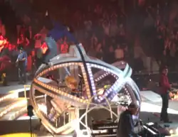 A large 4-sided video monitor encases the drummer's sphere prior to the concert; it is raised as the band makes their entrance.