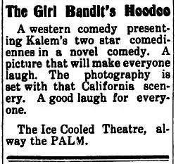 - ^ "Kalem's Releases And Casts of Characters"/"The Girl Bandits' Hoodoo", Kalem Kalendar, June 15, 1912, p. 3. Both of the given references were retrieved via Internet Archive, May 7, 2023.