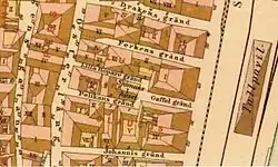 In the Johannesgränd/Österlånggatan corner (marked as VII on the map) lies one of the blocks largest houses. The house is shaped like a horseshoe and has an underground courtyard facing Johannesgränd. The building has a rusticated and plastered facade, which was added in the late 18th century, and a painted socle. Dimension stones wrap around the portal. There is a store on the bottom floor.