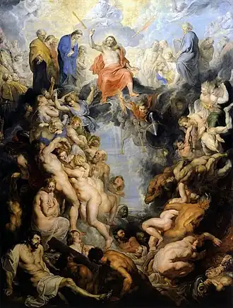 The picture and two associated side panels were commissioned by Wolfgang Wilhelm von Pfalz-Neuburg[2] and were intended to serve as the altarpiece of the high altar in the court church in Neuburg an der Donau, which was handed over to the Jesuits in 1618 as part of the Counter-Reformation. The colossal nature of the picture and the pictorial program are to be understood against the background of the looming Thirty Years' War and the Counter-Reformation, which was pushed forward with great severity in the Principality of Pfalz-Neuburg. The motif of the Last Judgment was the most popular symbol of Counter-Reformation propaganda, along with that of the falling of the angels by Archangel Michael. However, the painting caused offense because of the depicted naked bodies and was partially covered up until finally the grandson of the donor, Johann Wilhelm, brought it to the Düsseldorf gallery in 1692.[3]