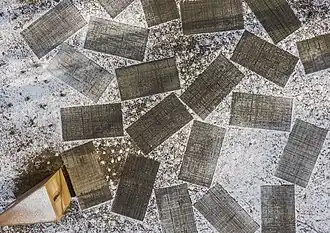 Granite slabs, previously considered industrial waste, were selected for the lines created when the sandstone slabs had served as a base for cutting other raw materials. Notches of different depth intersect and cross, which can be read as a symbolic representation of human fates crossing and heading in different directions.[4]