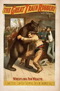 Porter (and possibly Anderson) drew on various sources when planning the scenario for The Great Train Robbery.[11] Western themes were already popular in films and other entertainment, reflecting the wide public interest in stories about the past and present of the American West. Many American films before 1900 can be classified as Westerns,[12] such as actuality views of cowboy life, staged Western anecdotes like A Bluff from a Tenderfoot and Cripple Creek Bar-Room Scene (both 1899), and shots of Annie Oakley and of Oglala and Brulé dancers from Buffalo Bill's Wild West Show (both 1894).[13] Studios abroad also began telling Western stories early on, with Mitchell and Kenyon's 1899 British film Kidnapping by Indians the first known example.[14] Edison's 1901 film Stage Coach Hold-up, based on Buffalo Bill's "Hold-up of the Deadwood Stage" act, probably influenced Porter directly.[11] Porter may have also been inspired by recent real events related to the American West: in August 1900, Butch Cassidy and his gang had robbed a Union Pacific Railroad train and escaped capture,[15] and in September 1903, Bill Miner's gang made an unsuccessful holdup of an Oregon Railroad and Navigation Company train.[16]