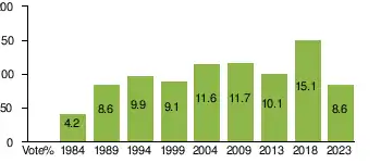 In the 1999 elections, the party lost a considerable number of votes (falling to 9%), but retained its five seats in the Chamber and re-gained its single seat in the European Parliament.