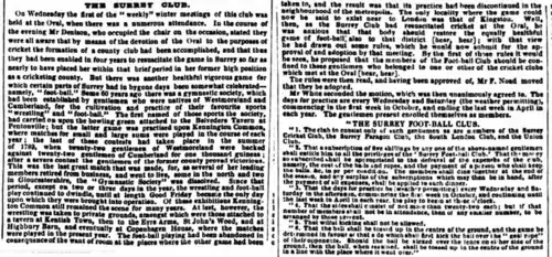 It is possible that the rules of the Surrey Football Club (1849) were based upon those of the original Gymnastic Society, as the founder William Denison referred to the Society in his speech and both clubs played with twenty-two players a side.[5]