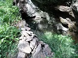 A spring known as the 'Wishing Well'[1] was located near the rock shelter or cave.[2] One reference states that this deep well is actually located within the cave[1] or at the entrance.[5] The name 'Wishing Well' has been interpreted as deriving from Saxon and meaning the "Wise man or Instructor's Well".[2] The most popular time to visit the well was on the first Sunday in May when water was collected for its supposed curative properties, and it is further recorded that on occasions the local minister was persuaded to visit the well to baptise children using its holy water.[1] The well's name also implies the common practice of making wishes and offerings of coins and other items.[1]