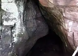 A shelter would most likely have once existed at the cave entrance although no recognisable signs survive of concavities etc used to support such an arrangement. Some apparent man-made workings on the rock face exist close by; however, there is an absence of religious symbols or graffiti of any kind. However, the soft red sandstone is easily eroded by rain and wind action, and any such markings may have been lost even if they ever existed.