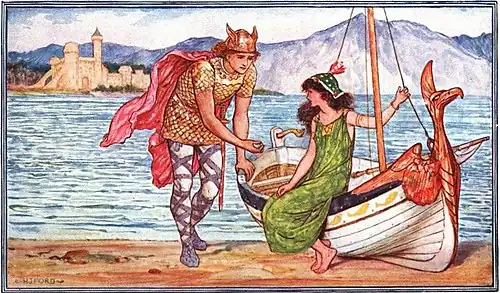 The last giantess, after her defeat at the end of their bout, now steered Sigurd towards a fresh adventure, declared him "stronger than ever you were" (that is to say, no longer withered and restored to full health "orðinn frískur aftur"), and wishing him luck. He was to go to a nearby lake, find a little girl (called Helga) playing with a boat, and befriend her with the gift of a little gold ring that the last giantess provided. Sigurd became the girl's playmate during the day, and when evening fell, persuaded Helga to take him to her home, past her initial objection, on account of her father being a "fierce giant".[g]
