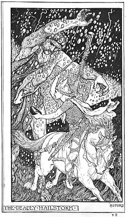 - ^ According to the Icelandic and German versions, the rider must "prick the other side of the stone, which is white" in order to bring about the hailstorm properly against his enemy, rather than receiving a self-inflicted attack himself. Lang supplies embellishment about the hails being the size of "pigeons' eggs" and slaying everyone "twenty miles around."