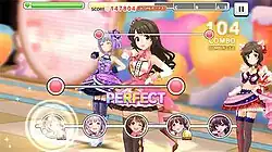 To play the Live mode, the main portion of Starlight Stage's gameplay, the player must first assemble a unit of five idols consisting of a center idol, whose center effect is applied to the unit, and four other members. The unit also consists of ten back members automatically selected by the game based on their statistics points and a guest idol belonging to another player, who must be chosen by the player.[8] Like other games in the genre, the player plays the Live mode as he or she listens to a selected song. Each song is assigned one of four categories: cute, cool, passion, and all type; the song's category affects the appeal values of idols that belong to the same category. During a song, a predetermined sequence of Rhythm Icons scroll from top to bottom towards the target icons in one of five lanes, and the player must tap the target icons as the Rhythm Icons pass over them. In addition, the sequence may also include notes that must be continuously held down or flicked in one direction.[7] The player is scored by the timing accuracy of these taps and is given one of four ratings: Perfect, Great, Nice, Bad. Although the score is not deducted if the player fails to hit a note, the idol unit's life bar decreases whenever the player misses or receives a Bad rating. If the life bar goes down to zero, the song will end prematurely.[7] Scoring is also affected by each idol's skill, which provides different gameplay benefits and are activated automatically at random. The complexity of the song's sequence varies based on the player's selected difficulty for the song as well as its level; there are four difficulty levels: Debut, Regular, Pro, and Master from the easiest to the hardest.[7] An additional difficulty level, Master+, is available for certain songs during special game events. Players are restricted from the number of songs they can play at one time by a stamina gauge, which depletes each time the player plays a song and replenishes over time, when stamina drink items are used, or when paid items called Star Jewels are used.[9]