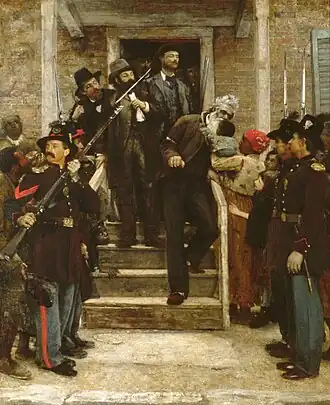 The Last Moments of John Brown depicts John Brown being led to his imminent execution. The scene contains a mix of historical details, some accurate and some inaccurate. The work is historical, and is based on a fictionalized account of Brown's execution. Aspects such as the clothing worn by the subjects in frame are accurate; Hovenden went so far as to interview witnesses to the event, including Brown's jailer.[1] The depiction of Brown kissing a slave child originated in an account of the execution published in the New York Tribune on December 6, 1859, and repeated in other newspapers, illustrations and early biographies. In fact, however, the episode never occurred, as Brown encountered only soldiers and jailors on his way to the gallows. [4]