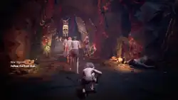 The Lord of the Rings: Gollum is an action-adventure game played from a third-person perspective.[a] Gollum can climb around levels, using marked ledges and vines to traverse environments. In hostile areas, the player must avoid guards, triggering an instant game over if the player is caught. Long grass and shadows provide a way for the player to hide, and if a helmetless orc is encountered, they can be taken out. A button can be pressed to highlight useful objects or waypoints if the player becomes lost or confused.[2]