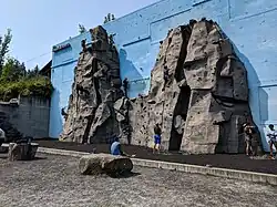The climbing wall outdoors at The Mountaineers building at Magnuson Park.