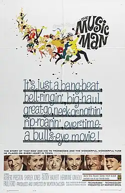 The Music Man is a 1962 American musical film directed and produced by Morton DaCosta, based on Meredith Willson's 1957 Broadway musical of the same name, which DaCosta also directed. Robert Preston reprises the title role from the stage version, starring alongside Shirley Jones, Buddy Hackett, Hermione Gingold, Ronny Howard, and Paul Ford.