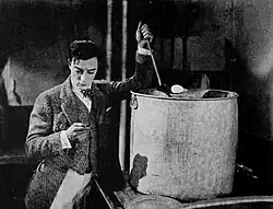 Keaton renamed the ship Navigator and his crew began remodeling the interior, installing film lights and painting it. Of the 60 person film crew about half were real sailors hired to handle the ship. Filming on board the Navigator took 10 weeks, mostly off Catalina Island.[2] Keaton initially hired Donald Crisp to direct the dramatic scenes, leaving himself free to concentrate on the comedic ones. However, Crisp was uninterested in drama and "turned gagman overnight on me!" according to Keaton. Keaton found Crisp difficult to collaborate with[5] and informed Crisp that the shooting was over just as an excuse to get rid of him. Keaton then resumed filming without Crisp.[2] After completing production on board the Navigator, Keaton began shooting the underwater scenes in the Riverside municipal pool. They had to extend the pool's concrete walls to 20 feet and submerged a 12-foot prop propeller. However the extra weight in the pool caused the bottom to cave in and Keaton had to move production to Lake Tahoe to finish the underwater scenes.[2] To cope with the cold temperature of the lake, Keaton and his cameraman drank bourbon. It took Keaton several weeks to complete what would become a few minutes of underwater footage in the finished film. The delays caused the film to go over budget, which Keaton and Schenck fought over.[6]