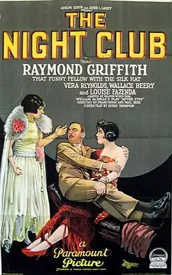 The Night Club is a 1925 American silent comedy film directed by Paul Iribe and Frank Urson and written by Cecil B. DeMille, Keene Thompson, Walter Woods, and William C. deMille. The film stars Raymond Griffith, Vera Reynolds, Wallace Beery, Louise Fazenda, and William Austin. The film was released on April 27, 1925, by Paramount Pictures.[1][2][3]
