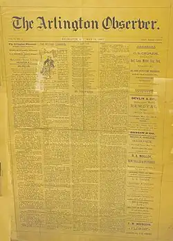 The forerunner of The Observer was a weekly newspaper, entitled the Kearny Republican.[4] It officially began operation on May 14, 1887, as The Arlington Observer. The name Arlington is from the section of Kearny along the Greenwood Lake Branch of the Erie Railroad.