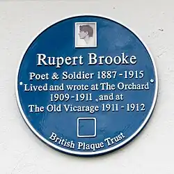 Blue plaque commemorating poet Rupert Brooke at Orchard House and the Old Vicarage. Unveiled 25 April 2015.