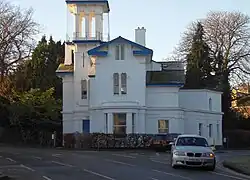 The Park is teardrop shaped and at the point of the teardrop is the building which was to be the entrance to the Gardens, which is called Cornerways and has a high tower.[3] The original design included a grand promenade and a crescent of villas and was engraved by J. Fisher.[4]