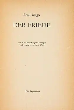 "The Peace" (German: Der Friede. Ein Wort an die Jugend Europas. Ein Wort an die Jugend der Welt, lit.'The Peace: A Word to the Youth of Europe: A Word to the Youth of the World') is an essay by the German writer Ernst Jünger. It was intended for Allied readers in the event of a German rebellion against the Nazi Party during World War II. It lays out a peace proposal and further visions that involve the creation of a European federation, which could take inspiration from Switzerland and the United States.[1] Similarly to Novalis in Christianity or Europe, Jünger argued that serious engagement with theology is more important than a constitution for upholding peace in Europe.[2]