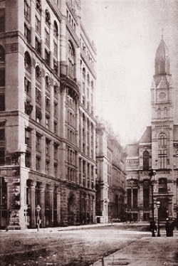 Lasalle Street: Old Chicago Board of Trade (right) and Rookery Building (c. 1891)