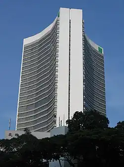 The tower has a distinctive triangular prism design, with each face being concave.