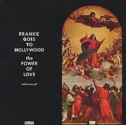 The track was first featured during the John Peel sessions the band performed on during 1983, which was slower and emphasised the track's original camp ironic content (such as the Hooded Claw from the cartoon series The Perils of Penelope Pitstop). After recording at the original speed, ZTT/Trevor Horn sped it up, this also caused a change in pitch. "The Power of Love" became Frankie Goes to Hollywood's third consecutive (and last) UK number 1 single in December 1984. To commemorate the Christmas release, Godley & Creme directed a Nativity-themed video for the single, filmed outside Jerusalem, and the artwork for the single also used traditional Christian iconography.[2] The original showing of the video on The Tube featured the Nativity occupying the whole screen, however the borders of band members were added for later showings due to pressure from UK broadcasters.