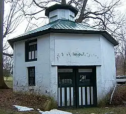 The octagon house is situated on a promontory about 25 feet above and 75 feet westerly from a natural ford on Canadaway Creek. The promontory is located at the junction of the upper and lower portage trails that ran along the westerly side of the creek during Native American times. The lands in this region were occupied by the Erie people until the mid-seventeenth century, then by the Seneca people until the end of the eighteenth century. Following the Treaty of Big Tree in 1797, the lands were transferred to the Holland Land Company, which subdivided them for sale as farms. Canadaway Creek's name was derived from the Native American name pronounced "Ga-Na-Da Wa O," which was translated as "running through the hemlocks."[1] The Seneca settlement of Ga Na Da Wa O extended from Lake Erie southerly to Laona, New York, and the later village of Fredonia and city of Dunkirk, New York were known as the settlement of Canadaway from 1809 to 1817.[2]