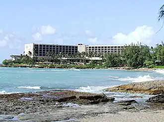 The hotel opened in May 1972 as Del Webb's Kuilima Resort Hotel & Country Club.[3] In the Hawaiian language kui lima means "joining hands".[4] It was built by casino developer Del Webb (1899–1974) to be the first casino on the island; a gaming initiative was on the ballot in the mid-1970s but it did not pass. Hyatt Hotels later took over the property and it operated first as the Kuilima Hyatt Resort Hotel and later as the Hyatt Kuilima Resort until August 1983 when Hilton Hotels & Resorts assumed management,[5] and the hotel was renamed Turtle Bay Hilton and Country Club. Hilton ceased managing the property on August 31, 2001,[6] and the hotel became the Turtle Bay Golf and Tennis Resort.[3]