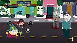 During the player's turn, a radial wheel listing the available options—class-based basic melee attacks, special attacks, long-ranged attacks, and support items—appears.[16] Basic attacks are used to hit unarmored enemies and wear down shields; heavy attacks weaken armored enemies.[17] A flashing icon indicates that attacks or blocks can be enhanced to inflict more damage, or mitigate incoming attacks more effectively.[18] Each special attack costs a set amount of "Power Points" or "PP" (pronounced peepee) to activate.[3][19] Only one party member can join the player in battle.[4] Certain characters, such as Tuong Lu Kim,[20] Mr. Hankey,[21] Jesus, and Mr. Slave can be summoned during battle to deliver a powerful attack capable of defeating several enemies simultaneously; Jesus sprays damaging gunfire, while Mr. Slave squeezes an enemy into his rectum, scaring his allies away.[17]