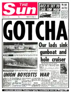 One of the paper's best known front pages, published on 4 May 1982, commemorated the torpedoing of the Argentine ship the General Belgrano by running the story under the headline "GOTCHA".[49] At MacKenzie's insistence, and against the wishes of Murdoch (the mogul was present because almost all the journalists were on strike),[50] the headline was changed for later editions after the extent of Argentinian casualties became known.[45][51] John Shirley, a reporter for The Sunday Times, witnessed copies of this edition of The Sun being thrown overboard by sailors and marines on HMS Fearless.[50]