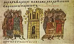 A variety of explanations for the images on the card have been attempted. For example, it may be a reference to the biblical story of the Tower of Babel, where God destroys a tower built by mankind to reach Heaven.[4] Alternatively, the Harrowing of Hell was a frequent subject in the liturgical drama of the Late Middle Ages, and Hell could be depicted as a great gate knocked asunder by Jesus Christ. The Minchiate version of the deck may represent Adam and Eve's expulsion from the Garden of Eden.[2]