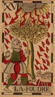This card follows immediately after The Devil in all tarots that contain it, and is associated with sudden, disruptive revelation, and potentially destructive change. Some early painted decks, such as the Visconti-Sforza tarot, do not contain it.[1]