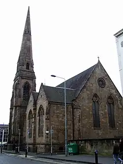 The building was founded as the Trinity Congregational Church. Originally designed by John Honeyman and completed in 1864,[2] it is a distinctive feature on the landscape with its Gothic Revival spire.