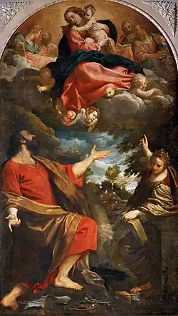 The Virgin Appears to the Saint Luke and Saint Catherine is an oil on canvas painting by Annibale Carracci, now in the Louvre in Paris.[1] It was commissioned in 1589 for the notaries' chapel in Reggio Emilia Cathedral and completed three years later[2] It is also known as The Virgin of Saint Luke, The Saint Luke Madonna and Child and Apparition of the Virgin to Saint Luke and Saint Catherine. Luke was chosen as the patron saint of both painters and notaries, appearing twice, at bottom left and top right. The work was looted from Italy by Napoleon's troops in 1798, placed in the Louvre and not returned to Italy after the end of the Napoleonic Wars.