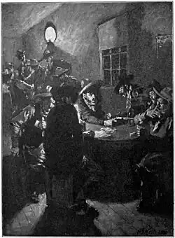 The Virginian is a ranch hand at the Sunk Creek Ranch, located outside of Medicine Bow, Wyoming. His friend Steve calls him "Jeff" presumably after Jefferson Davis, but he is always referred to as the Virginian, and no name is mentioned throughout the story. He is described as a tall, dark, slim, young giant, with a kind, deep personality. At first, he is only a cowboy, but halfway through the book, he is signed on as the full-time foreman. He is Judge Henry's most trusted worker. Several times throughout the book, he is offered the chance to run down his enemy, Trampas, behind his back, but each time he refuses the temptation, until Trampas challenges the Virginian to a duel. It is made clear that he will not use his official position as foreman to crush any of his employees. One of the main plots is the Virginian's ongoing romance with the newly appointed "schoolmarm" of Bear Creek School, Miss Molly Stark Wood. Being from the East, she is not used to the wild West, and the Virginian is a perfect gentleman to her, intending to make her "love him before we get through."[1]