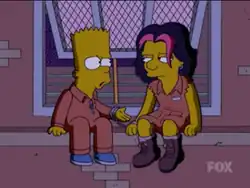 At the detention center, Bart is afraid he will be buried alive in the sandpit or photographed being punched while going down a slide. He soon notices that the girls' Juvie is on the other side of a chain-link fence. Bart attempts to schmooze with these girls, only to have them attack and immobilize him. One of the girls, Gina Vendetti, uses a knife to destroy Bart's uniform, threatening to castrate him next time he comes near their fence. Bart's problems continue when two weeks before his release he is partnered with Gina for the dance by the warden. When they are dancing, Gina escapes with Bart using a rope, finding themselves on a window ledge. Due to the fact that they are handcuffed together, Gina is forced to bring a reluctant Bart along before the window can be closed, though he only comes after she kisses him. Slowly, they gain each other's trust.