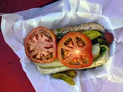 The establishment is known for its char-grilled food, especially its hot dogs and hamburgers (commonly called char-dogs and char-burgers).[5] A Wieners Circle char dog with "the works" is a grilled Vienna Beef hot dog on a warm poppy seed bun, topped with mustard, onions, relish, dill pickle spears, tomato slices, sport peppers and a dash of celery salt.