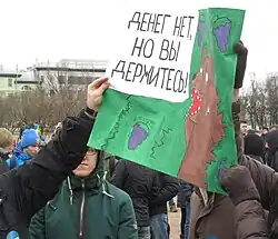 "There's no money, but hang in there" (Russian: «Денег нет, но вы держитесь») is a Russian catchphrase derived from a dismissive reply of Russian then-Prime Minister Dmitry Medvedev to a pensioner from the Russian-occupied Crimea's complaint about a small pension in 2016. It was variously translated into English as "There's just no money. But you take care",[1] "There is no money. But be strong",[2] etc. The catchphrase later became an Internet meme,[1] mocking official wishes to stay resilient amid economic negligence.