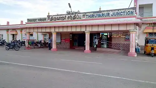 Thiruvarur Junction (station code: TVR) is an NSG–5 category Indian railway station in Tiruchirappalli railway division of Southern Railway zone.[1] It is a junction railway station serving Thiruvarur town, headquarters of Thiruvarur district in Tamil Nadu in India and a focal point on the branch line connecting trains from Chennai to Nagapattinam–Velankanni–Nagore–Karaikal on one line and Karaikkudi–Sivganga–Manamadurai–Rameswaram on the second line and Tiruchirappalli–Thanjavur–Thiruvarur–Nagapattinam–Karaikal on the third line and Mayiladuthurai–Thiruvarur on the fourth line that branches out of the station.(I.e the station is situated between mayiladuthurai to Karaikudi section of TPJ divn)The station is a part of the Trichy railway division one of the 6 divisions of the Southern Railway zone.